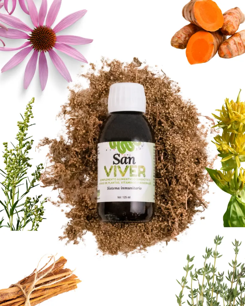 Gracias a su fermentación simbiótica, San VIVER no solo conserva las propiedades naturales de las plantas, sino que las transforma en nutrientes más activos y biodisponibles, generando postbióticos y metabolitos que no están presentes en extractos o polvos convencionales.
